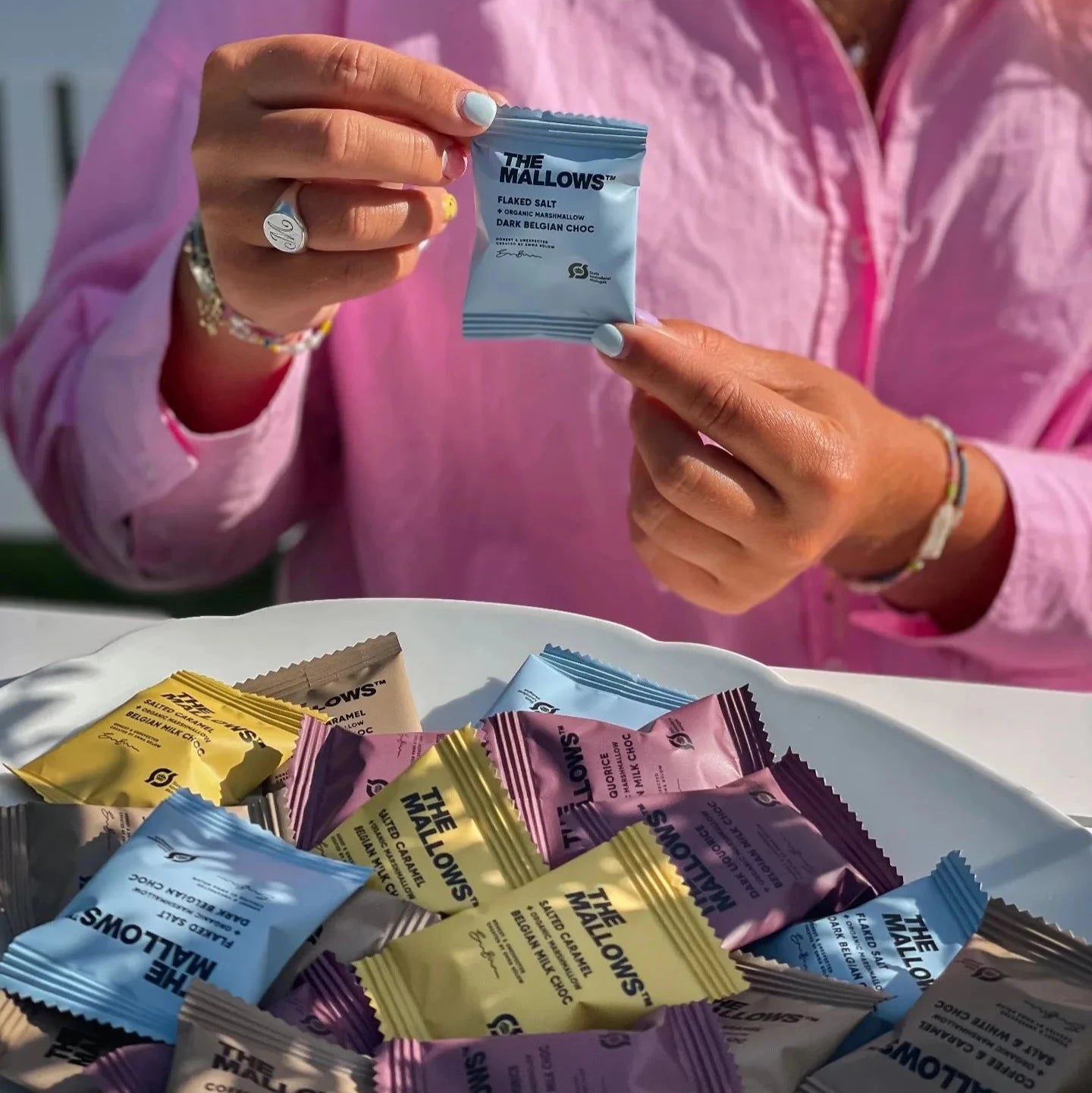 A mix of 5 different individually wrapped chocolate marshmallows.